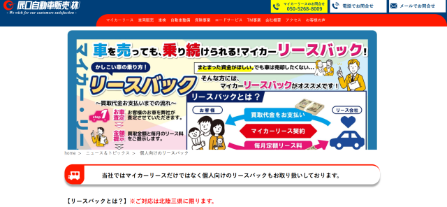 辰口自動車販売のリースバックは、整備工場を併設した地域密着型サービスが特徴で、定額プランに車検・点検・オイル交換・タイヤ保管などが含まれている点が大手との差別化ポイントです。